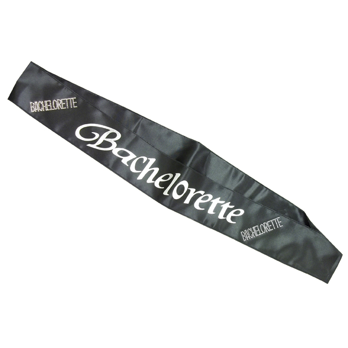 Non-flashing black Bachelorette sash with silver lettering and clear stones